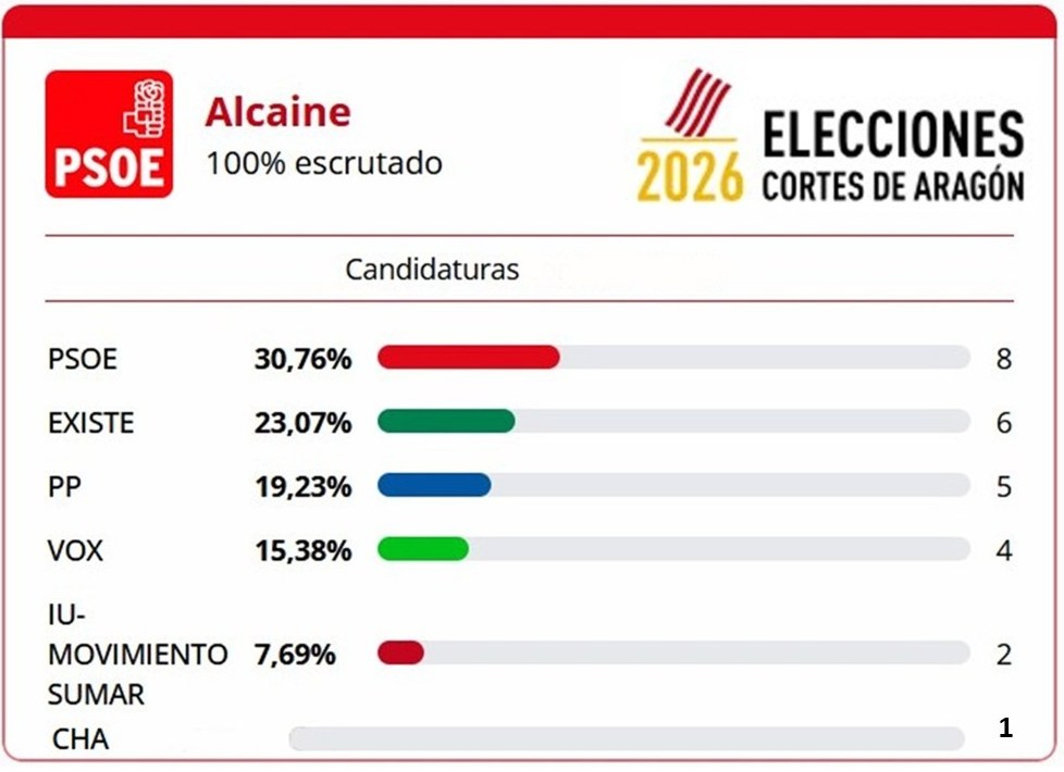 En MUNIESA, PP 94 votos; EXISTE 59; PSOE 53; VOX 32 y CHA 7 votos.