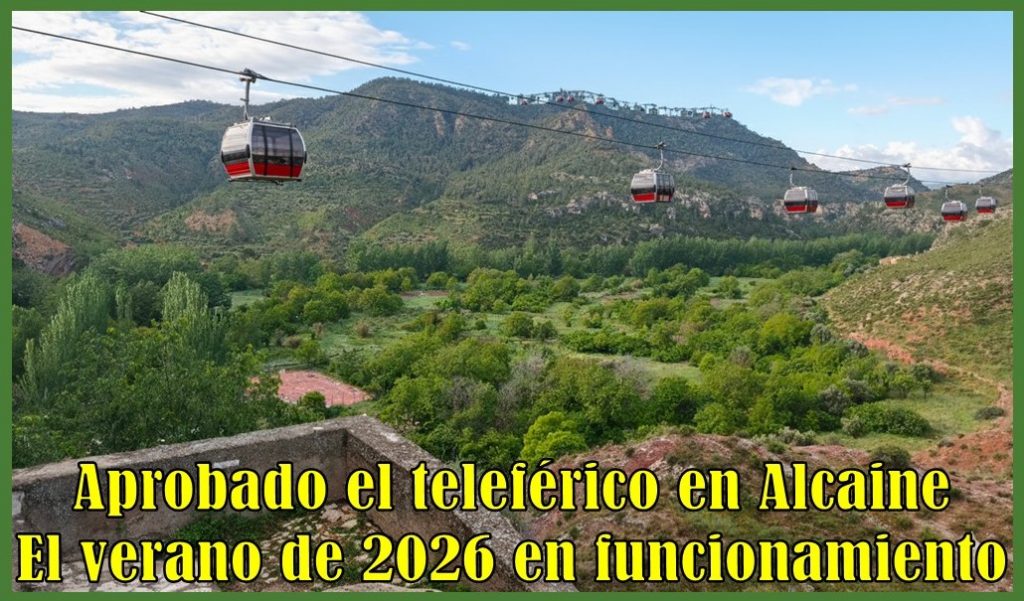 Lo que parecía un sueño, que muchos habían expresado, se va a hacer realidad en apenas 7 meses. Gobierno de España y de Aragón, han firmado la financiación del Proyecto de Construcción del Teleférico de Alcaine, al que se ha sumado la DPT y la Comarca que cubrirán el coste de las cabinas de pasajeros. El trazado de la línea será triangular, con 4 torres de soporte y tres puntos de acceso: la parte superior del Mirador de San Ramón (en el pueblo), el Cabezo de Benicozar (con un desnivel a superar de casi 200 metros) y de allí al punto más alto del término en el Cabezo Guardias. Si la subida desde el mirador hasta Benicozar será impresionante, lo verdaderamente espectacular será el trayecto -cruzando sobre la huerta- a una altura de 297 metros, para pasar de Benicozar al Guardias.
