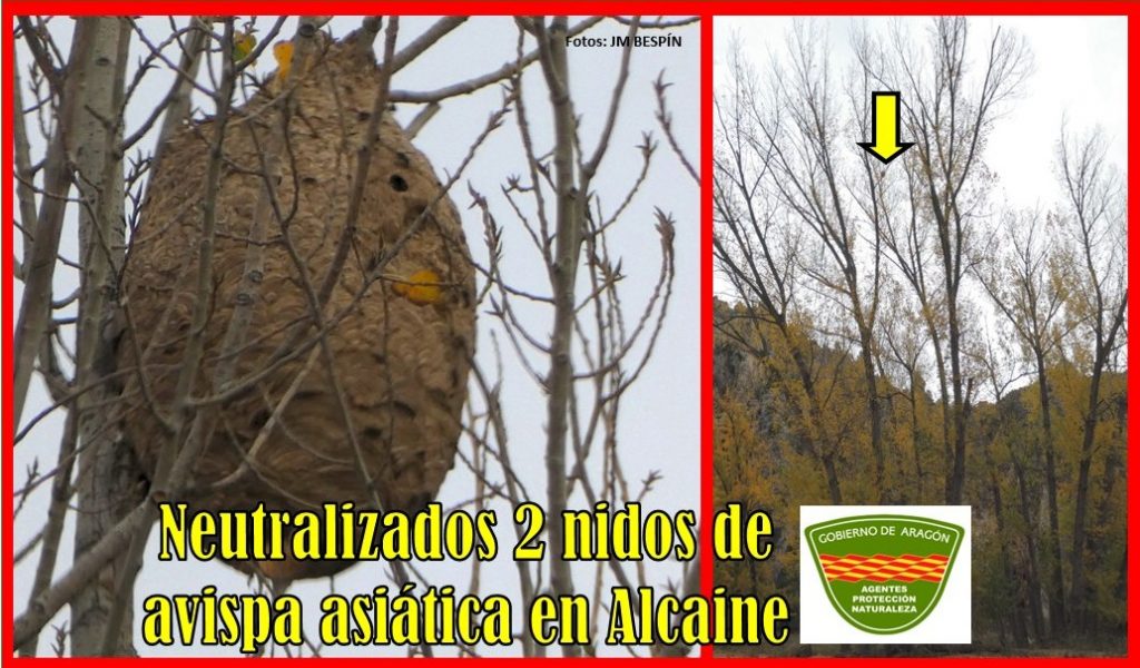 Algunos agricultores habían detectado la presencia de algunas avispas -diferentes de las autóctonas y más grandes- en los bancales con frutales de la huerta. Pero no fue hasta inicios de noviembre, cuando se identificaron numerosos ejemplares alimentándose de los frutos de la hiedra trepadora que hay en el talud de tierra, justo detrás de los contenedores de basura, en la entrada del pueblo… lo que incrementaba el peligro de picaduras. Comunicado el tema al Ayuntamiento de Alcaine, se cursó aviso inmediato -aún siendo fin de semana- a Ernesto, Agente de Protección de la Naturaleza (APN) con sede en Muniesa. Igualmente se tomó la decisión de publicar un Aviso a la población, advirtiendo de la peligrosidad y requiriendo a los vecinos a extremar las precauciones y dar aviso si descubrían algún nido, además de no manipularlo. Los nidos primarios los construyen a ras de suelo o a poca altura (cuidado, al desbrozar la hierba o zarzas) y los secundarios en lo alto de árboles o edificios. Personados los APN en Alcaine certificaron que eran velutinas y durante varios días estuvieron recorriendo la zona próxima: edificaciones, mirando bajo las plantas, árboles de la carretera, huerta y zona fluvial… dando como resultado la localización de dos nidos: uno (del tamaño de un balón) en lo alto de un chopo junto al río y el otro en una grieta de la roca frente al molino. Los Agentes procedieron a disparar al nido un elemento neutralizante y han repetido la operación para finalizar el tratamiento.